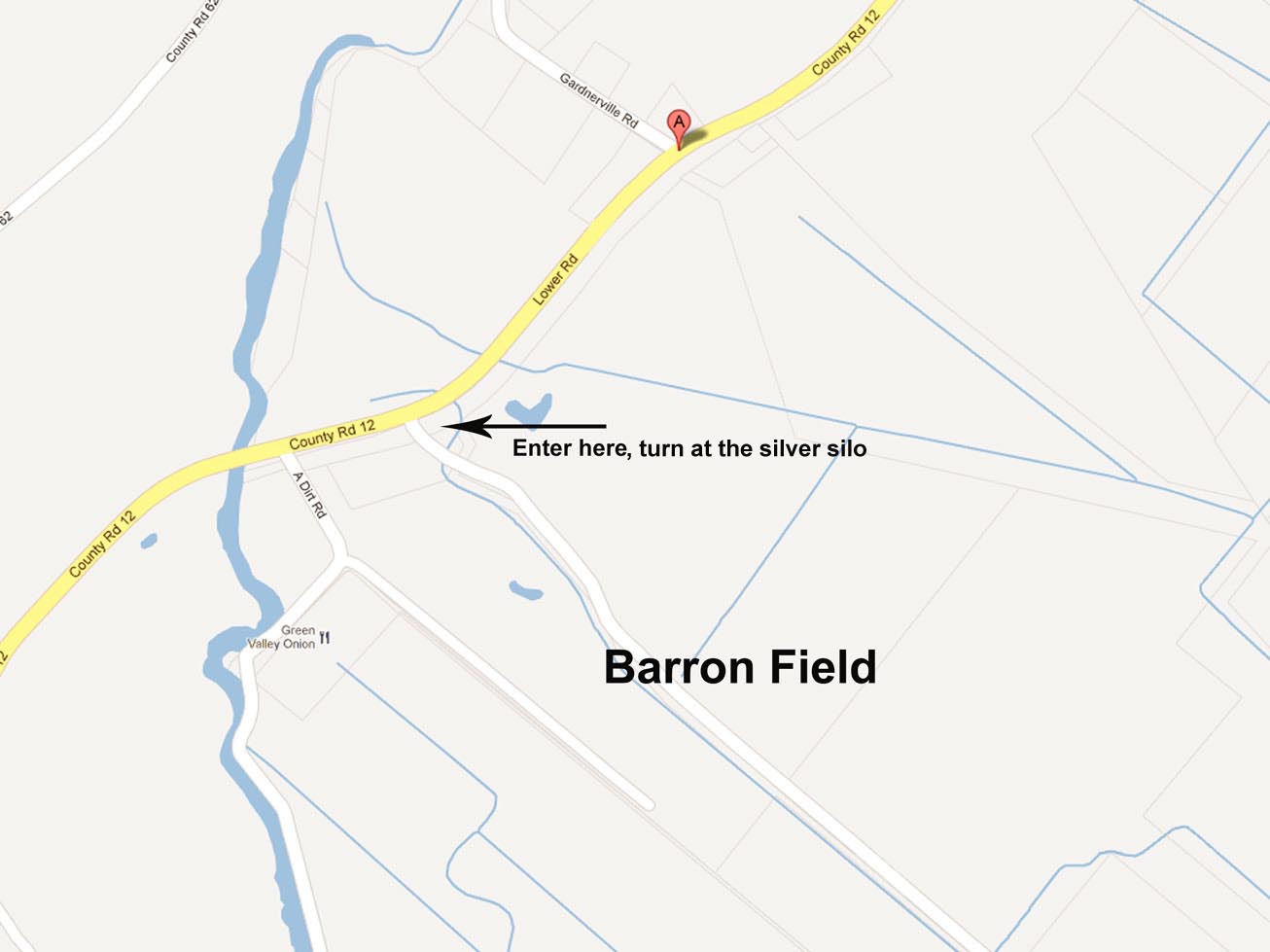 *From New England and from upper New York, take I-84 to exit 3, Rt. 17M, go east 1.5 miles, then south (right) on County. Rt. 12 for 6.3 miles. Field is on the left. [About thirty minutes from Newburg.]